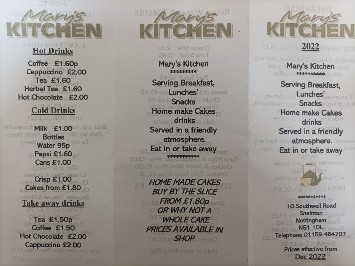 Welcome to Mary's Kitchen, a charming café nestled in Nottingham, renowned for its heartwarming and homestyle dishes. The menu is a delightful mix of classic offerings, featuring everything from hearty cooked breakfasts to tempting cakes made on-site. Customers rave about the generous portions and reasonable prices, making it a perfect spot for families and solo diners alike.